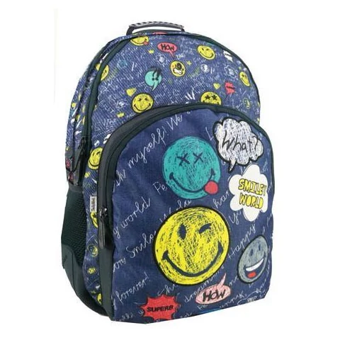 A hátizsák smiley mintát kapott, farmer színű alapra, ami nagyon jól mutat, ráadásul nagyon kényelmes a használata is, köszönhetően párnázott hátfalának és vállpántjainak.