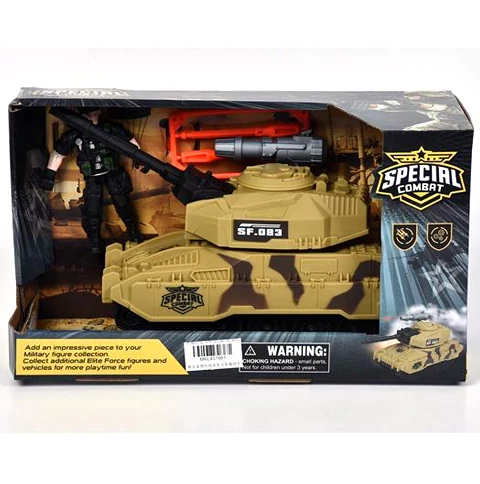 Ez a nagyszerű játékszett remekül kombinálható a többi Special Combat készlettel, így a gyerekek idővel egy egész nagy katonai haderőt gyűjthetnek össze, ami igazán remek játékélményt tartogat a kicsik számára. A ebben a készletben egy sivatagi terepmintával álcázott tank található, aminek a forgatható lövegtornya és az állítható csöve minden célpontot képes befogni. A huszonhat centiméteres tank részletgazdag kidolgozást kapott, illetve a csomagban találni egy vagány akció figurát, aminek a végtagjai mozgathatók, és néhány extra felszereléssel is elláthatjuk őt.