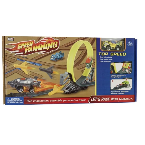 Kezdődhet a verseny a Speed Running versenypálya szett segítségével, ami a hagyományos méretű kisautók számára kínál egy izgalmas versengési lehetőséget. A pálya egyszerűen összeépíthető és tartalmaz egy nagyon izgalmas hurkot is, amit csak akkor tudnak teljesíteni a versenyzők, ha kellő lendülettel érkeznek a kezdőpontjára. A készletben természetesen található egy kisautó is, hogy azonnal ki lehessen próbálni, illetve a szett része az indító szerkezet is.