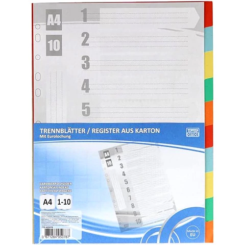 Gyűrűs mappákhoz tökéletes kiegészítés ez a fehér lapokat tartalmazó elválasztó szett, melynek része összesen 10 oldal, színes index-szel, valamint egy tartalomjegyzék oldal. Az A/4-es méretű elválasztó lapok tökéletesen lefűzhetők, hiszen 11-luykas kialakításuknak köszönhetően éppen ott illeszkednek a mappába ahol kell. A színes elválasztólapokkal jól elkülöníthetők a témakörök a mappán belül, így átláthatóbb, rendezettebb lesz annak tartalma.