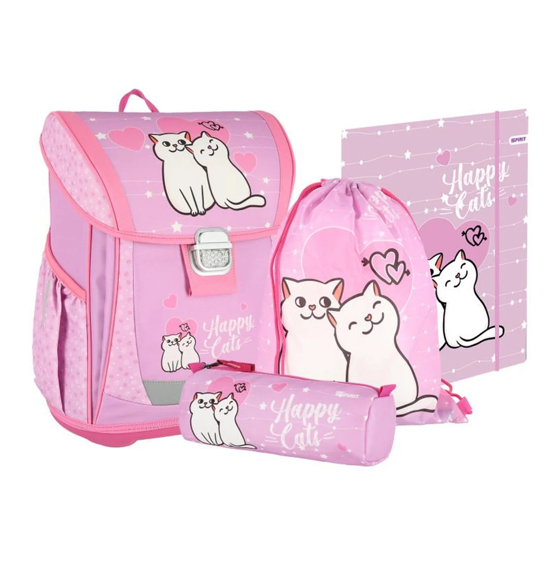Indítsd útra gyermekedet az iskolakezdés során a Spirit Happy Cat kollekció világos rózsaszín alapú iskolatáskájával! Ez a két fehér cica mintával díszített 4 az 1-ben csomag mindenre felkészít: az ergonomikus, merevfalú táska mellett egy A/4-es gumis mappa, egy praktikus tornazsák és egy hengeres, cipzáros "bedobálós" tolltartó is megtalálható benne.