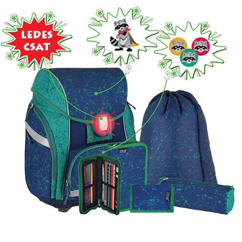 Ez a iskolai felszerelés csomag remek választás azoknak a gyerekeknek, akik szeretik, ha minden felszerelésük összhangban van, hiszen a készletben lévő tolltartók, sportzsák, pénztárca és iskolatáska is vagány kék színben pompázik, sőt a hátizsákot különféle mintákkal is lehet díszíteni. A hátizsákot a mutatós és variálható mintája mellett a kényelmes és praktikus kialakítás is jellemzi. A kényelemről a széles, állítható vállpántok, illetve a jól szellőző, párnázott hátrész gondoskodik, ráadásul a táska a gyerekek növekedéséhez állítható. A praktikus kialakítás pedig a hatalmas belső rekeszből valamint az első és oldalsó zsebekből állnak, ami jól rendszerezhetővé teszik a táska tartalmát. Végül de nem utolsó sorban a táska fényvisszaverő csíkokkal, és a LED világítással felszerelt csattal teszi biztonságossá a gyerekek útját a suliba és haza.