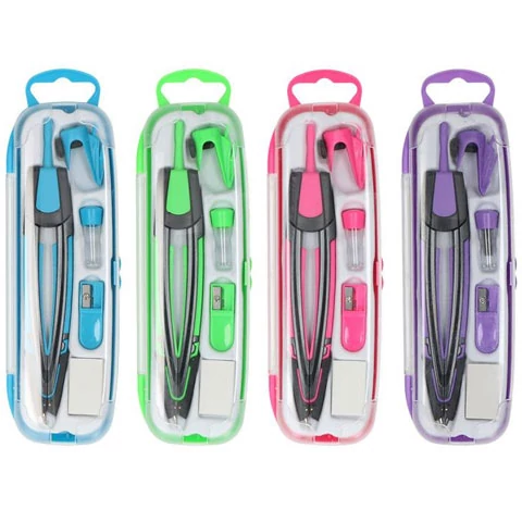 A körzők elengedhetetlen kellékei a matematika óráknak, így biztosan nagy segítség lehet ez a szett, amiben minden megtalálható, amire szükség lehet egy körző használatakor. A szettben egy különleges megjelenésű körző található, mely színes elemeket is kapott, így nagyon jól mutat. A körző dobozában mindennek megvan a saját helye, mint például a körző hegynek, a körzőhegy hegyezőnek, a radírnak és az adapternek, amely segítségével akár ceruzát is használhatunk a jelöléshez.