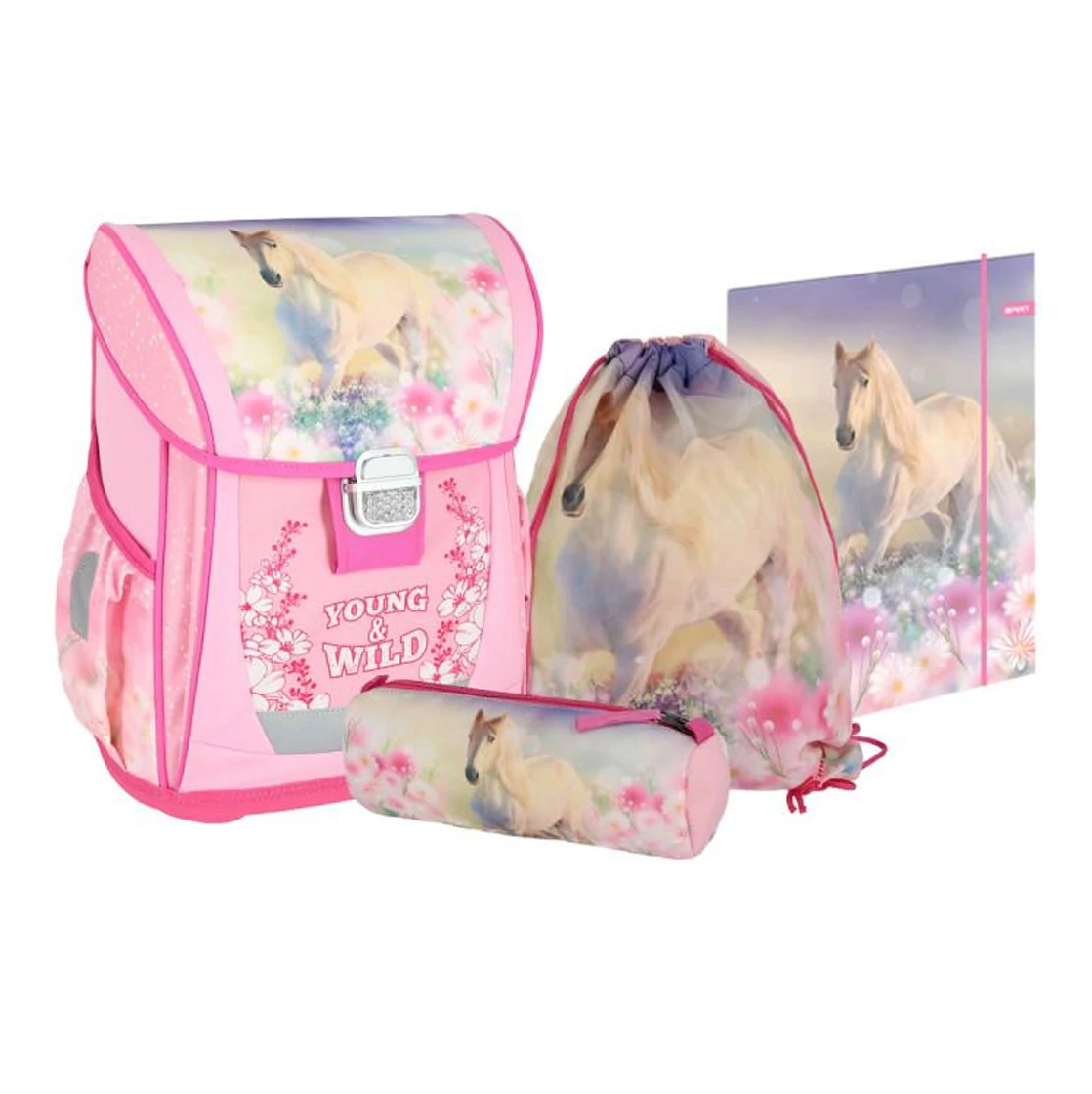 Engedd, hogy a Spirit Young and Wild kollekciója stílusosan kísérje gyermeked az iskolába! A világos rózsaszín alapú táska virágos és fehér lovas mintája igazán különlegessé teszi. Ez a 4 az 1-ben csomag mindenre felkészít: az ergonomikus, merevfalú iskolatáska mellett egy A/4-es gumis mappa, egy praktikus tornazsák és egy hengeres, cipzáros "bedobálós" tolltartó is megtalálható benne.