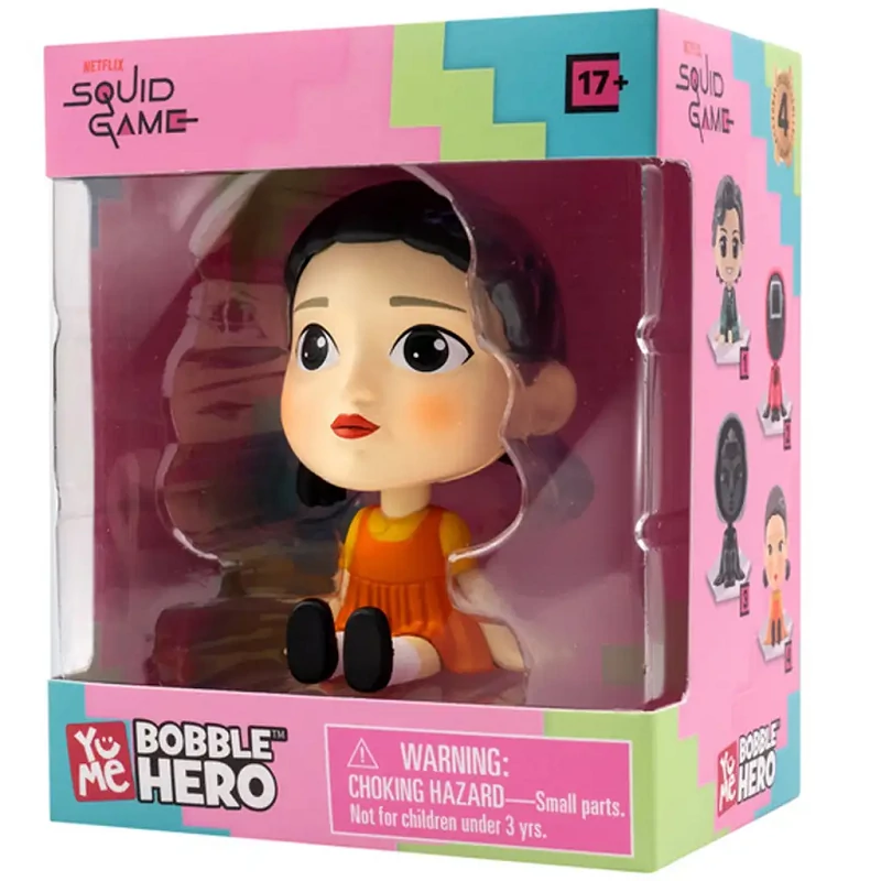Ez a figura a YuMe Bobble Hero gyűjtői sorozat része, így tökéletesen illik a többi Squid Game karakter mellé, mint a Frontember vagy Seong Gi-Hun. A Young-Hee figura aranyos külseje ellenére hűen idézi a sorozat emlékezetes jelenetét, amelyben a babaszerű gép félelmet nem ismerve figyeli a játékosokat.