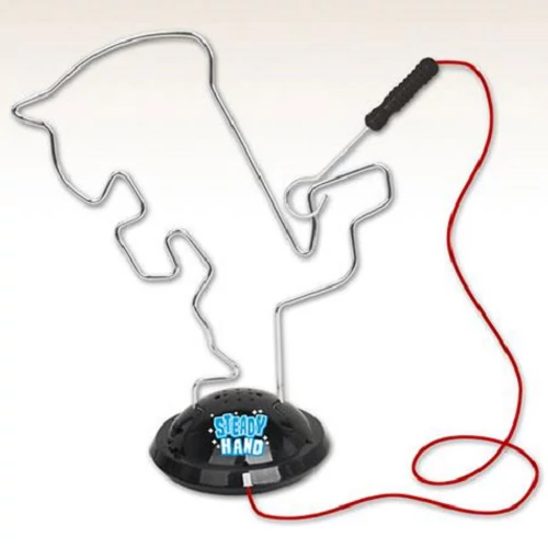 Tedd próbára magad, hogy milyen ügyes vagy, mennyire biztos a kezed, és milyen pontosan tudod követni a bikát ábrázoló vonalat ezzel a különleges ügyességi játékkal. A Steady Hand ügyességi játék szabályai meglehetősen egyszerűek, csak be kell tenni a talapzatba a két darab AAA ceruzaelemet és be kell kapcsolni. Ezután a kézi pálcával úgy kell végigkövetni a drótból kialakított formát, hogy a gyűrű egyszer se érjek a huzalhoz. Amint hibázunk, a játék azonnal fénnyel és hanggal jelzi. A játék remekül fejleszti a szem-kéz koordinációt, valamint a finom-motoros készségeket.