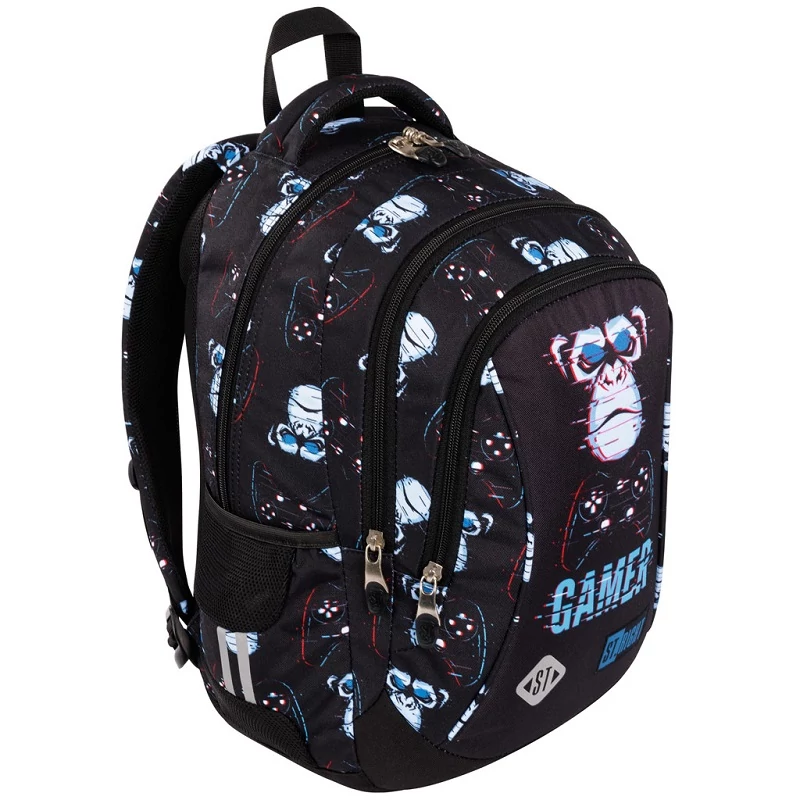 A St.Right Blue Gamer BP26 iskolatáska tökéletes választás az általános iskola 1-3 osztályos tanulói számára, akik szeretik a modern, vagány mintákat. A táska fekete alapon jelenik meg, amelyet egy kontroller és egy mosolygós, virtuális képet idéző majom arca díszít, így igazán egyedi megjelenést biztosít.