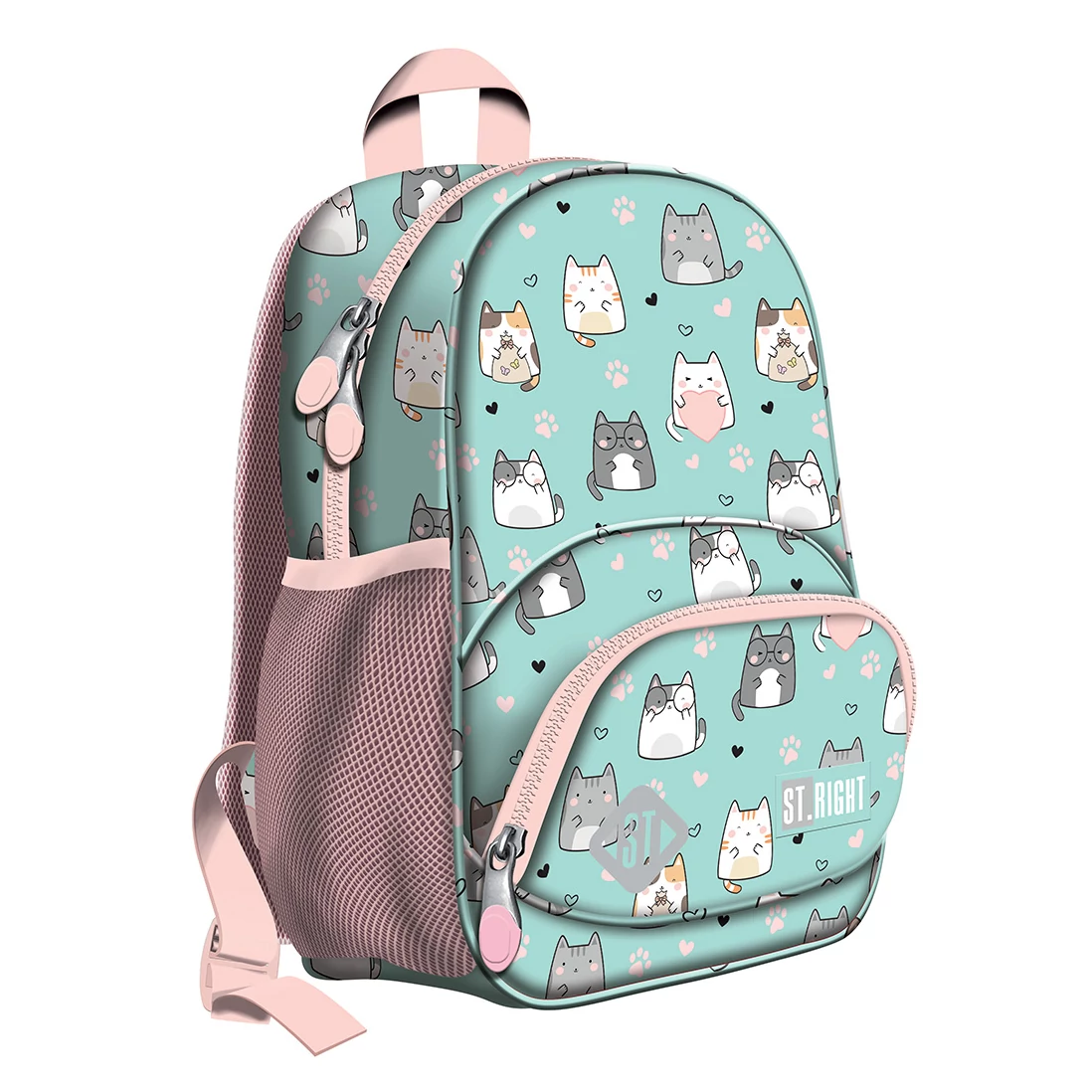 A St.Right Charming Cats cicás iskolatáska BP70 egy igazán bájos és praktikus választás a kisebb iskolások számára! A táska halvány türkiz alapszíne vidám és barátságos megjelenést biztosít, amit aranyos cicás minták, tappancsnyomok és kis szívecskék díszítenek. A rózsaszín részletek és cipzárak lágyítják az összképet, így a hátizsák igazi kedvence lesz minden állatbarát gyermeknek.