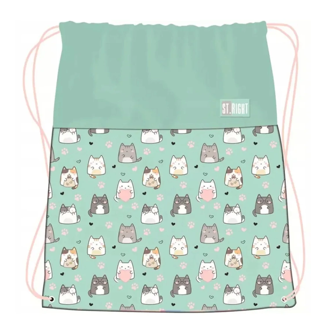 A St.Right Charming Cats tornazsák minden cicakedvelő gyermek és tini álma! Ez a bájos sportzsák vidám, macskás mintáival és pasztell színeivel garantáltan mosolyt csal az arcokra, legyen szó iskolai testnevelés óráról, edzésről vagy akár kirándulásról. A halványzöld alapon aranyos cicák, mancsnyomok és apró szívecskék díszítik a zsákot, így az nemcsak praktikus, hanem kifejezetten stílusos is. A rózsaszín zsinórok pedig tökéletesen harmonizálnak a zsák színvilágával, még csajosabbá téve azt.
