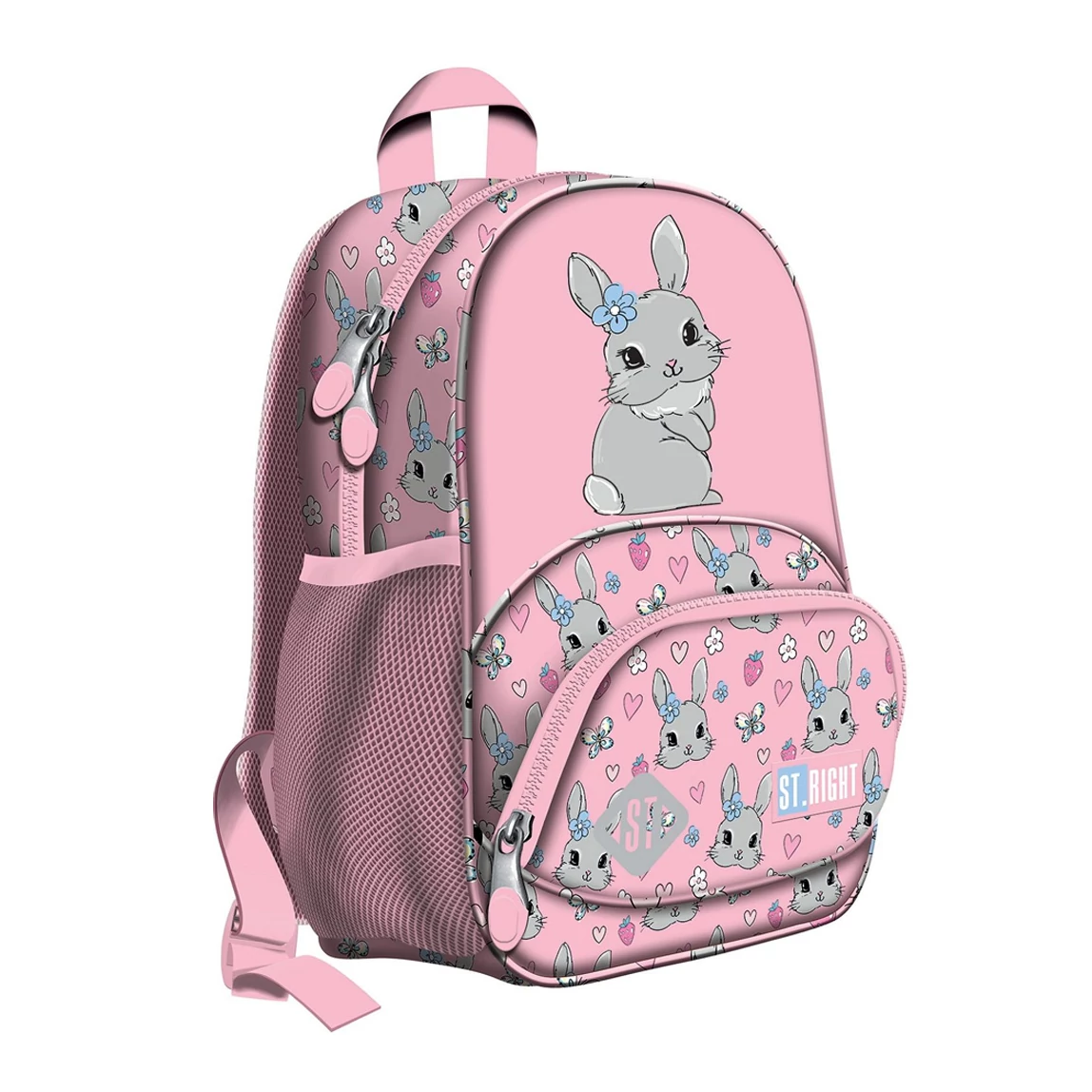 A St.Right Cute Rabbit nyuszis iskolatáska, hátizsák BP70 egy igazán bájos és praktikus választás a legkisebbeknek. Ez a 32 x 22 x 11,5 cm méretű, kompakt iskolatáska tökéletesen megfelel óvodás és kisiskolás gyerekek igényeinek, hiszen könnyű, kényelmes és remekül rendszerezhető. A rózsaszín alapon aranyos, virágos fejkendőt viselő nyuszikák és kis szívecskék teszik vidámmá és szerethetővé a dizájnt, ami biztosan elnyeri a gyerekek és a szülők tetszését is.