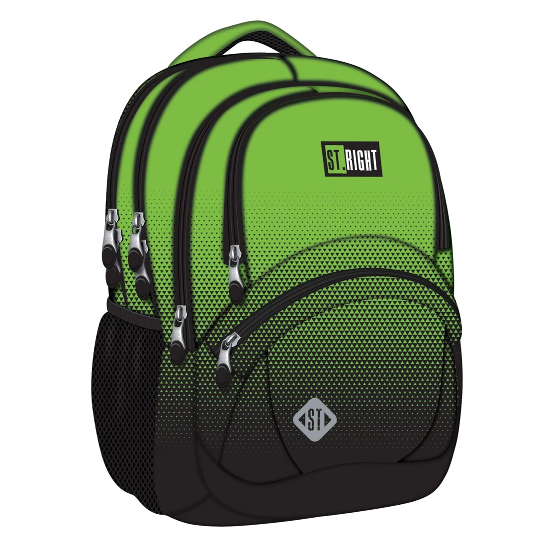 A St.Right Green Gradien iskolatáska BP05 42x30x19 cm-es méretével ideális választás minden kisiskolás és felsős számára, aki egy modern, lendületes megjelenésű és praktikus hátizsákot keres. A táska zöld-fekete színátmenetes dizájnja igazán sportos és trendi, ami minden öltözékhez jól passzol, és fiúknak-lányoknak egyaránt tökéletes választás. A dizájnt a St.Right logó és az apró, geometrikus mintázat teszi teljessé, amely dinamizmust sugároz.