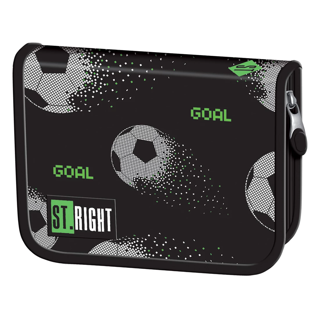 A St.Right Pixel labdák focis kihajtható tolltartó PC03 egy igazán menő választás minden focirajongó iskolás számára, aki szeretné, hogy az iskolai felszerelése is tükrözze a szenvedélyét. A tolltartó modern, fekete alapon pixel hatású labdákkal és zöld „GOAL” feliratokkal díszített dizájnnal készült, amely stílusos és trendi megjelenést kölcsönöz. Ez a minta garantáltan feldobja a mindennapokat, és remekül illik a sportos lelkületű gyerekek iskolai kellékei közé.