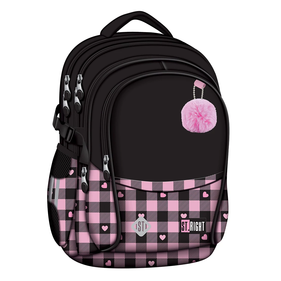 A St.Right Pink-Black Heart iskolatáska BP01 egy igazi stílusos és praktikus választás minden iskolás lánynak, aki szereti az aranyos és egyedi megjelenést! A rózsaszín-fekete kockás minta apró szívecskékkel díszítve, valamint a táska elején található bolyhos rózsaszín pompom igazán bájos külsőt kölcsönöz ennek a hátizsáknak, így gyermeked örömmel viseli majd nap mint nap.