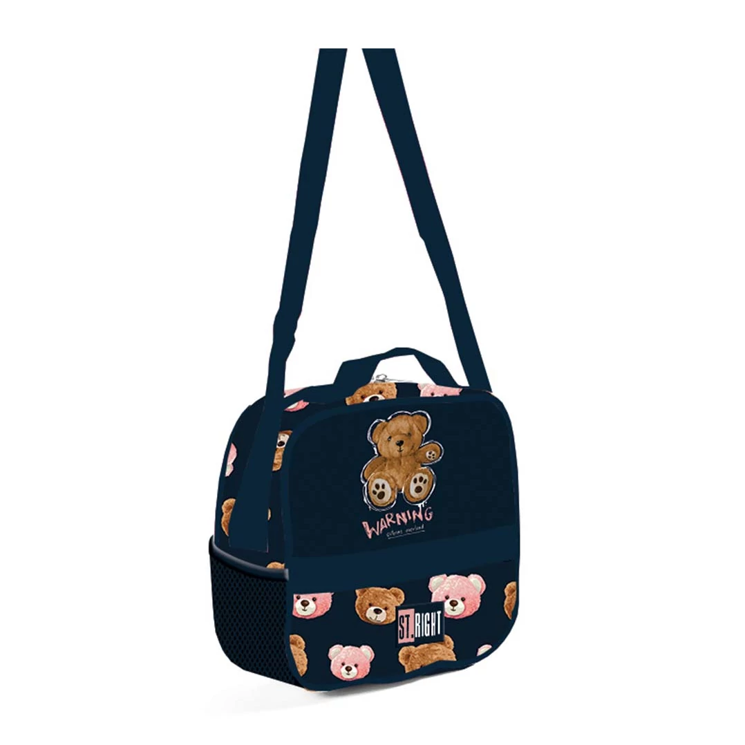 A St.Right Teddy Bear uzsonnástáska nemcsak praktikus, hanem egy aranyos és szerethető kiegészítő is a mindennapokra. A 22x11x21 cm-es méret tökéletes ahhoz, hogy gyermeked uzsonnáját, szendvicseit, gyümölcsét és italát biztonságosan és rendezett formában vihesse magával az iskolába vagy kirándulásra. A sötétkék alapon bájos macifejek és egy középen ülő maci figura díszíti a táskát, amit a „WARNING: Bear’s Special” felirat tesz még különlegesebbé. Ez a dizájn garantáltan elnyeri a gyerekek szívét, és mosolyt csal az arcukra minden nap.