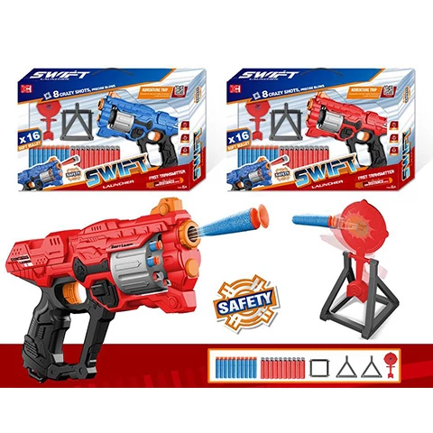 Szerezz be gyermeked számára egy kiváló minőségű, forgótáras Swift L szivacslövő fegyvert amelynek használatával biztonságosan veheti fel a harcot barátaival szemben. A szettben egy céltábla is megtalálható amely segítséget nyújt a pontos célzás elsajátításában és a gyakorlásban egyaránt. A szivacslövő fegyver kétféle színben érhető el, amelyek hozzájárulnak a két csapat megkülönböztetéséhez. A puha szivacs töltényeknek köszönhetően biztonságosan játszhat gyermeked barátaival és indulhat bevetésre akár a kertben, akár a lakásban játszva.