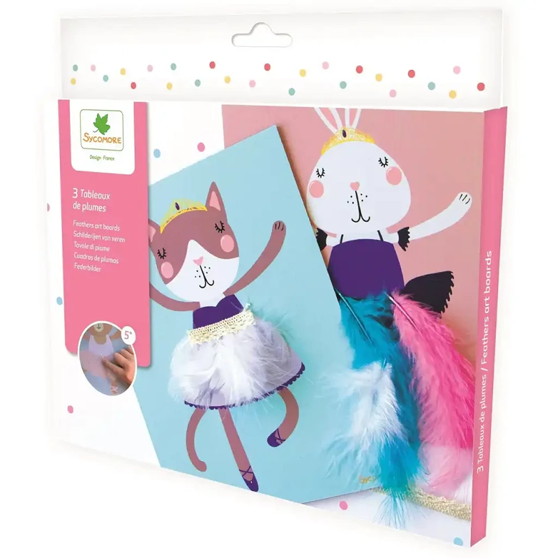 A Sycomore Tollkép készítő kreatív szett igazi álom minden kis kézműves számára, aki imádja az aranyos állatfigurákat, a csillogást és a színes tollakat! Ezzel a készlettel három bájos kis állatfigura – egy cica, egy nyuszi és egy mackó – kel életre, tüllszoknyában, díszes övvel és puha, színes tollakkal kiegészítve. A gyerekek saját ízlésük szerint dekorálhatják a figurák ruháit, így egyedi és látványos képek születnek, melyeket büszkén ki is lehet tenni a szobába.