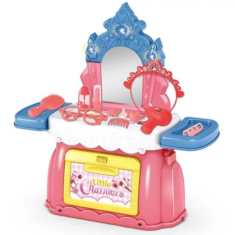 Ez a nagyszerű szépítkező készlet egy praktikus ládában érkezik a kislányokhoz, ami nem csak azt teszi lehetővé, hogy a játékok ne kallódjanak el, hanem pillanatok alatt át lehet alakítani egy smink asztallá, és a lányok azonnal kezdhetnek szebbekké válni. A készletben pedig olyan sminkeléshez és fodrászoláshoz szükséges kiegészítők kaptak helyet, mint az hajkefe, a hajszárító a különféle csattok és hajcsavarok, az elkészült frizurát pedig a tiara vagy a szemüveg kiegészítők tehetik teljessé.