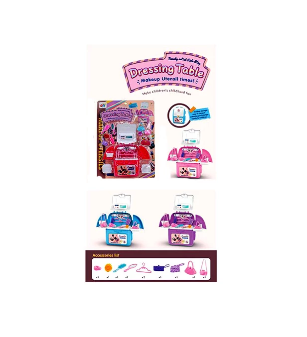 A kislányod biztos örülne egy ilyen játéknak, hiszen a sminkelős játékok a kedvenceik közé tartoznak. Ebben a szettben egy szépségasztal kapott helyet, amelyikben több kiegészítő van, amelyeket felhasználhatsz abban, hogy a babáidat szépítsd, fésüld és felkészítsd a városba menéshez. A szépségasztal több változatban is beszerezhető tetszés szerint, ugyanis több színváltozatból lehet választani. A kép alsó részén fel vannak tüntetve a csomagban levő kiegészítők is.