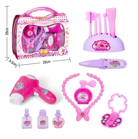 Egy igazán különleges szettet szerezhetsz be gyermekednek, melyben rengeteg kiegészítő megtalálható, melyekkel játszhat. A szett egy átlátszó fedelű kis bőröndben érkezik, melyet könnyedén ki lehet nyitni, belül pedig rengeteg csajos dolog várja. Hajszárító, sminkes paletta, ékszerek, különböző üvegcsék, parfüm és ecsetek találhatóak meg benne, melyekkel rengeteget játszhat és szépítkezhet. Ezeken kívül még egy hajsütővas is található benne, az egész szett pedig pink színben pompázik, így téve különlegesebbé.