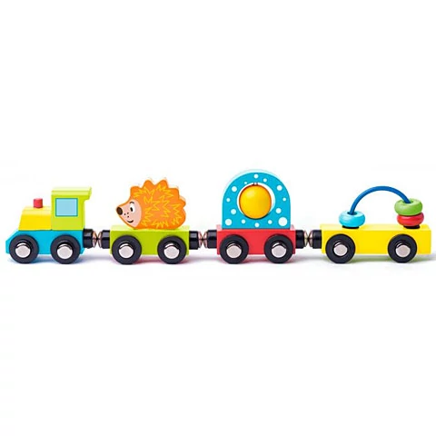 Különleges kis mozdonnyal és vasúti kocsikkal gazdagíthatják vasúti pályaszettjüket a gyerekek, melynek kocsijain egy süni vagy éppen különböző játékok is feltűnnek. A Woodyland színes vasúti szerelvénye a mágneses pontoknál összekapcsolható, így az a gyerekek számára izgalmas élmény lesz amint a szerelvényeket összeállíthatják és kombinálva a kocsikat útnak indíthatják őket a fa sínpályákon.