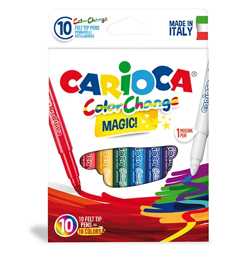 A Carioca színváltós filctoll készlete varázslatos lehetőségeket kínál a kreatívan alkotó gyerekek számára. A készletben kilenc darab színes filctoll található, amelyekkel pont úgy lehet rajzolni mint a közönséges társaikkal. Azonban a készletben van egy tizedik, fehér színű toll is, amellyel a többi filc színét tudjuk megváltoztatni. Elég csak besatíroznunk a lap egy részét különféle színekkel, és a fehér színű varázslatos tollal beleírhatunk bármint a színes részekbe. Engedd szabadjára a képzeleted és próbáld ki ezeket a varázslatos filceket.
