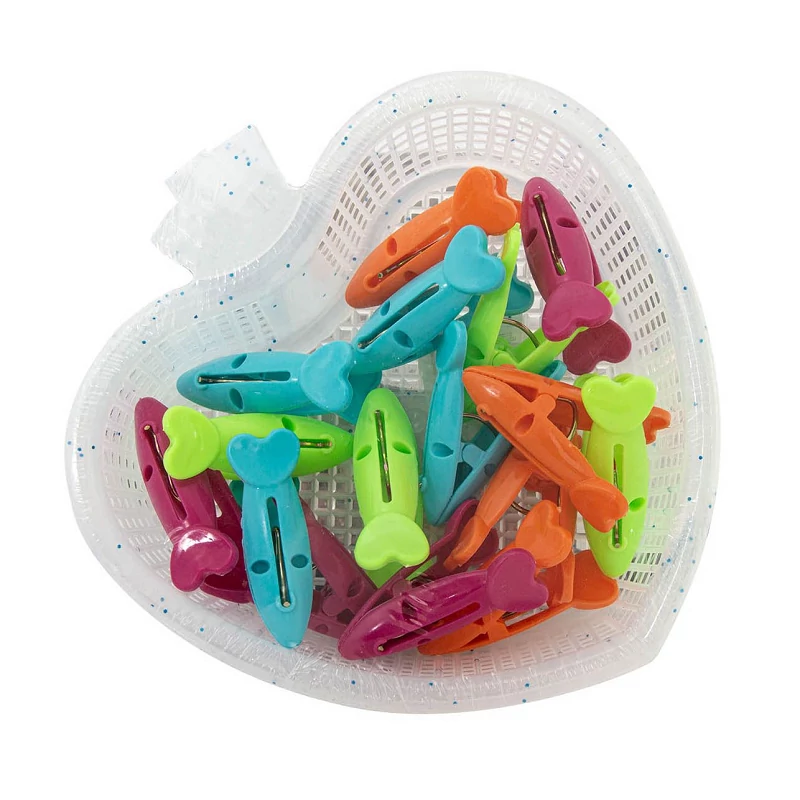Szív alakú, műanyagból készült csipesz 16 db színes csipeszekkel.