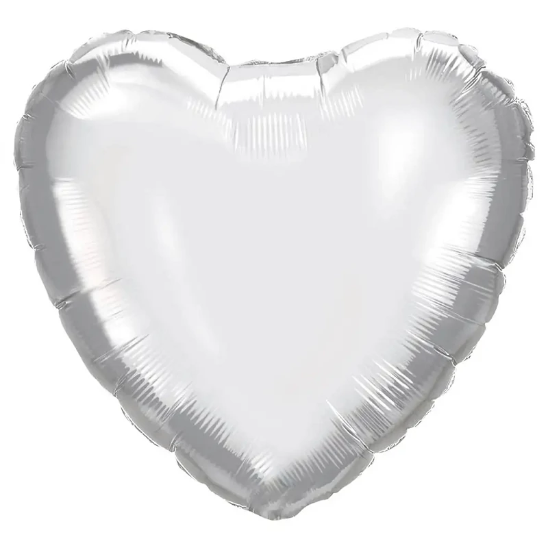 Szív alakú fólia lufi, ezüst színben, egyesével csomagolva. Héliummal vagy levegővel tölthető, 45 cm.