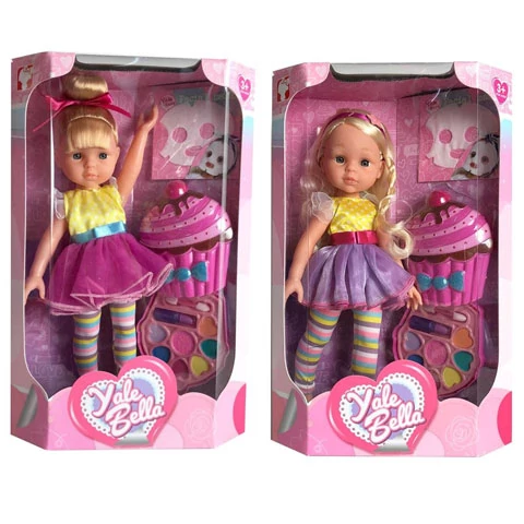 Szőke hajú baba színes ruhában, sminkszettel kétféle változatban