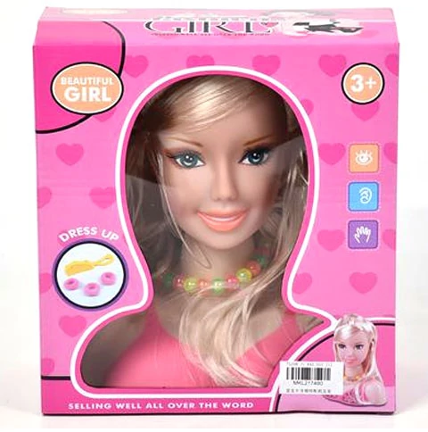 Szőke hajú fésülhető babafej fésűvel és nyaklánccal