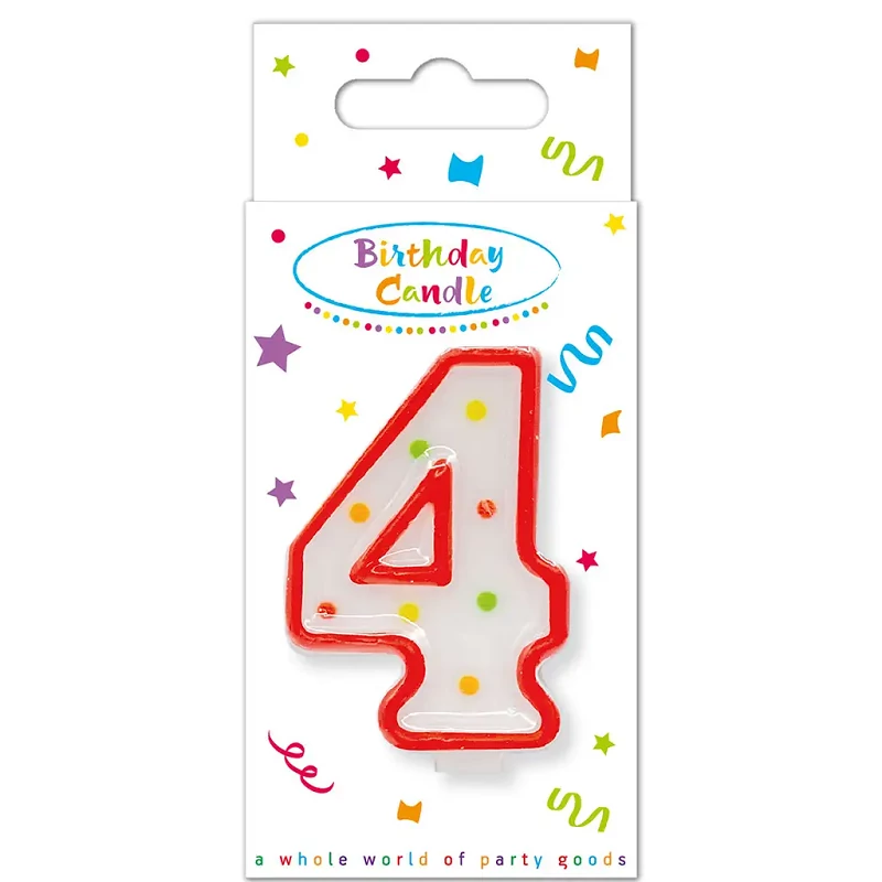 Ünneplésre fel! Ha a gyerkőcöd a negyedik születésnapjához érkezik, ez a vidám és színes 4-es számú pöttyös gyertya lesz a torta tökéletes dísze. A fehér alapon elhelyezkedő színes pöttyök igazán játékos, ünnepi hangulatot árasztanak, míg a piros kontúr gondoskodik arról, hogy a gyertya jól látható legyen még a gyertyafújás izgalmas pillanataiban is.