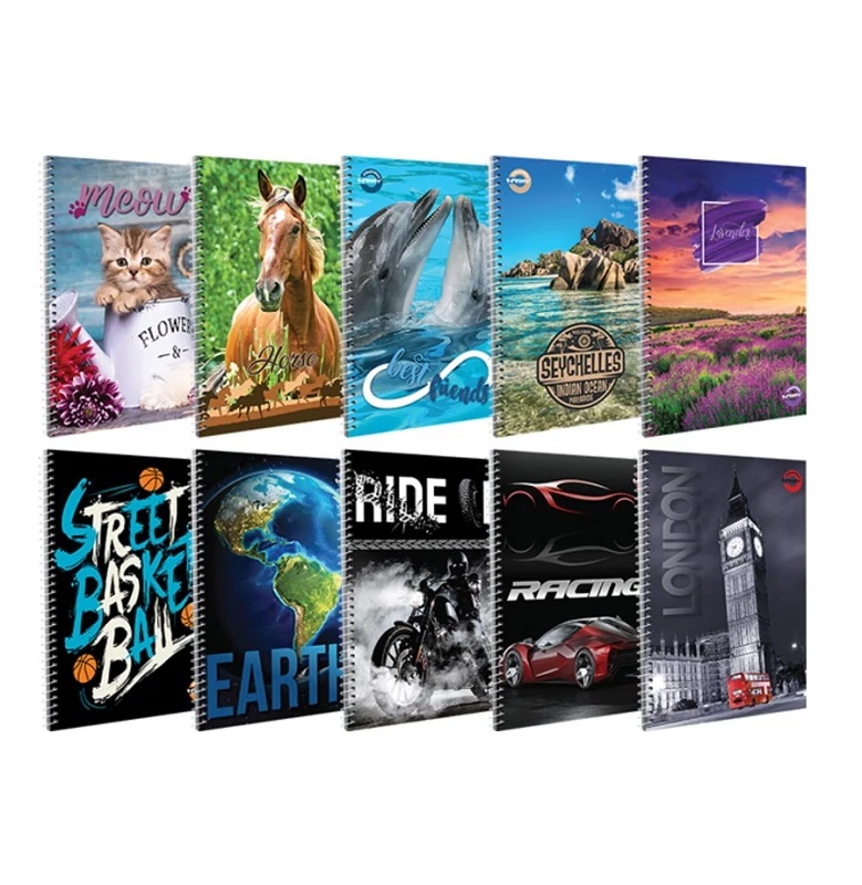 A/5-ös méretű, vonalas spirálfüzet, 10 különböző mintával. Dupla spirálozás, mely egyrészről stabilitást ad a füzetnek, másrészről hosszú élettartamot biztosít, mert a zárt spirálnak köszönhetően az nem sérül. 275 g-os borítója fényes fóliával bevont, ami időtállóvá teszi. Hófehér ofszet belívei a magyar szabványnak megfelelő vonalazásúak.