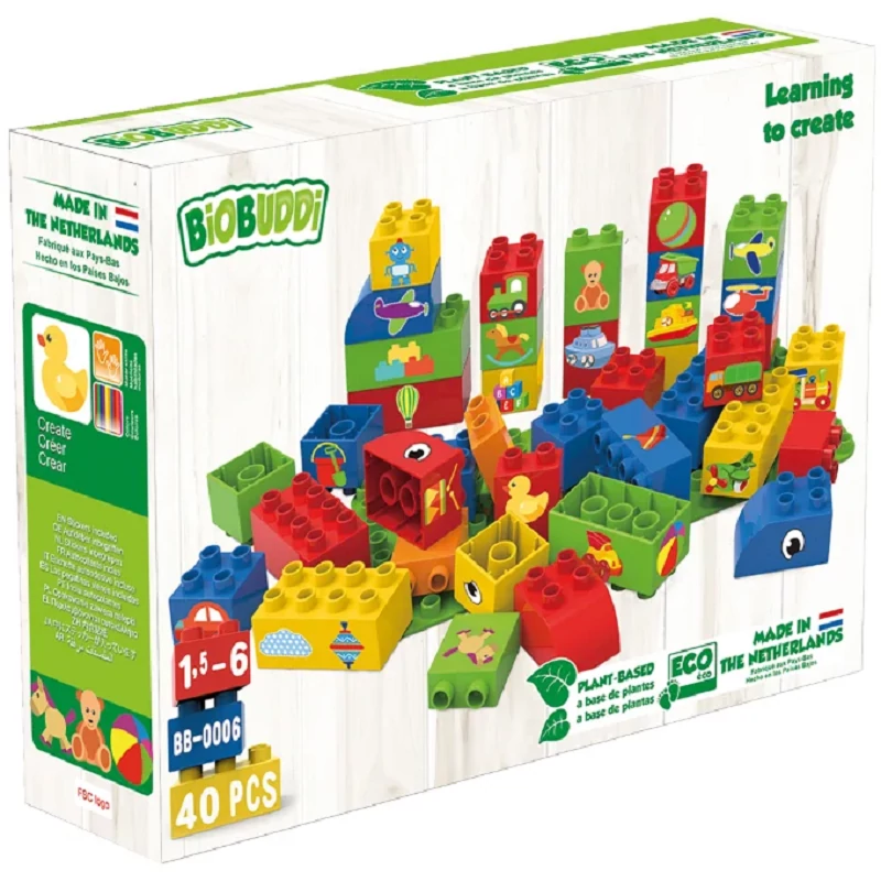 A bio alapú játékblokkok cukornádnövények maradványaiból Hollandiában készülnek. Az építőelemek környezetbarátak, fenntarthatóak, újrahasznosíthatóak és kifejezetten a kis kezek számára lettek tervezve. A szülők különböző képekkel díszíthetik a színes elemeket, hogy életre keltsék a fantáziavilágot! Ösztönözd gyermeked fejlődését színválogatással vagy finommotorikus tevékenységgel, és alkossatok együtt.