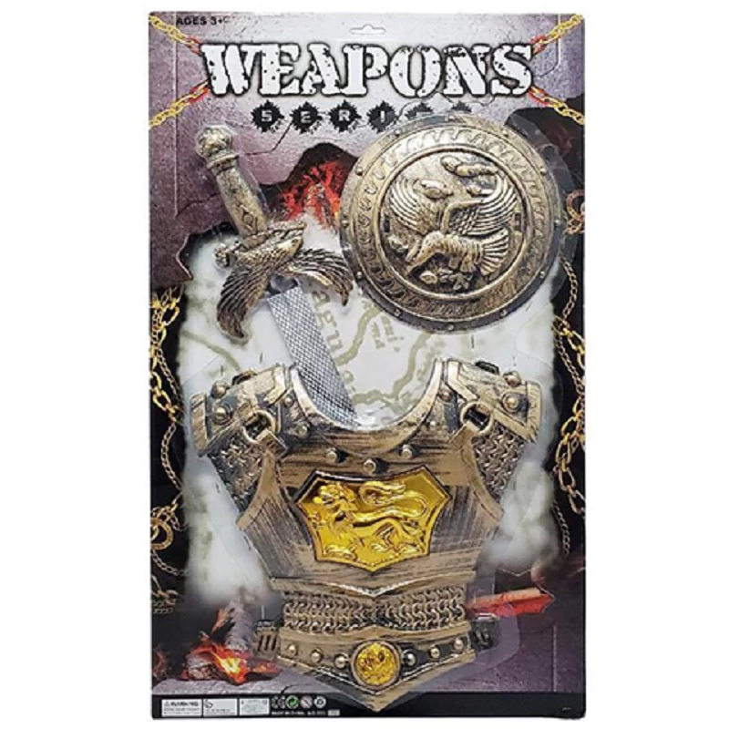 Szerezz be gyermeked számára egy részletgazdag kidolgozottsággal ellátott középkori harcos felszerelést, amelyben egy standard méretű testpáncélt, egy kardot és egy pajzsot is megtalálhat. A szett segítségével eljátszhat egy középkori összecsapást akár barátaival közösen is, hiszen a középkori csaták és háborúk könnyedén megmozgatják a fantáziáját. A szettben található kiegészítők strapabíró műanyagból készültek, a testpáncél standard méretű. A hajlékony műanyagból készült kard veszélytelen használatot eredményez, így akár már három éves kortól használatba veheti gyermeked újdonsült középkori felszerelését.