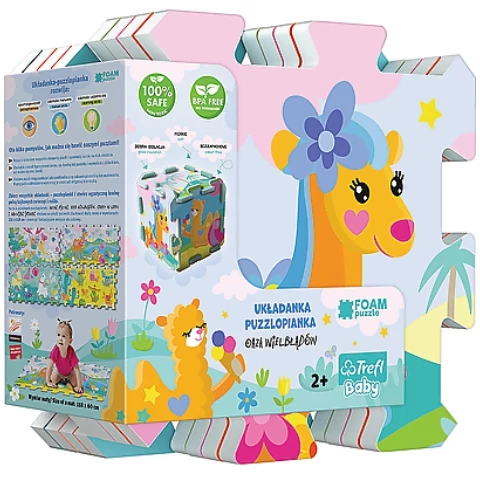 Aki szereti a tevéket és a sivatagos környezetet, annak biztosan elnyeri a tetszését ez a mozgalmas szivacs puzzle, melyen egy színpompás kép látható, amint a tevék éppen az oázis közepén pihennek. A nagy, puha puzzle-elemek segítségével a gyerekszobába kirakhatunk szőnyeget vagy akár falvédőt is. A különleges puzzle alkotóelemeket még akár 3 dimenzióban is összeállíthatjuk. A szett összesen 8db színpompás alkotóelemet tartalmaz. Használata két éves kortól ajánlott.