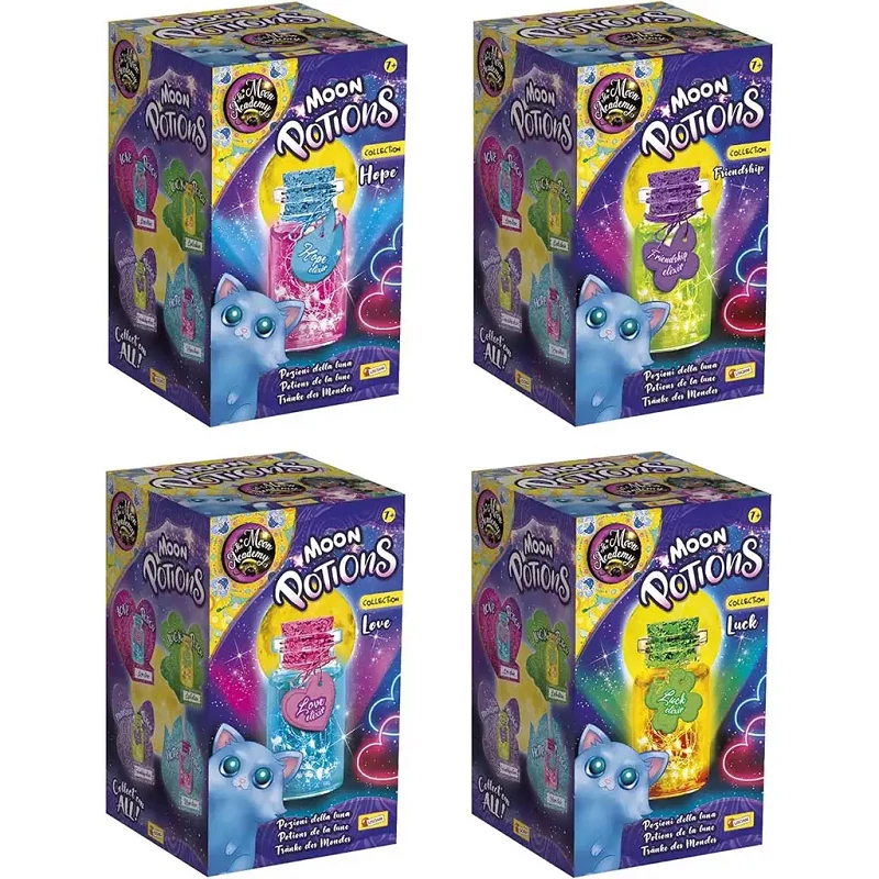 A kész varázsitalok LED-es világítással kelnek életre, így akár hangulatos éjszakai fényként is funkcionálhatnak. Négyféle változat gyűjthető – Love, Hope, Friendship és Luck –, a csomag egy meglepetés fiolát rejt. A fiolákon és az útmutatón szereplő szavak angol nyelvűek, így játék közben az idegen nyelvvel is ismerkedhetnek a gyerekek.