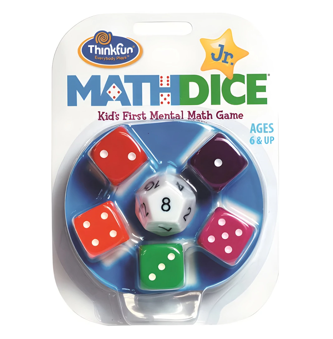 A Thinkfun Math Dice Junior társasjáték egy olyan matematikai játék, amelyet 2 vagy több játékos játszhat, és 6 éves kortól ajánlott.
