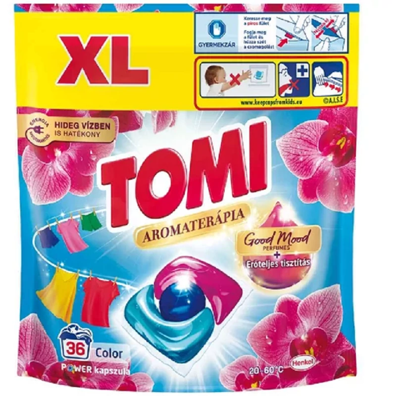 Tomi 3 az 1-ben Power Orchidea mosókapszula színes ruhákhoz. A Tomi Aromaterápia Floral Sensation Orchidea mosószer használatával ruhái nem csak ragyogóan tiszták lesznek, de a természetes virágesszenciáknak köszönhetően hosszantartó illatélményt is biztosít.