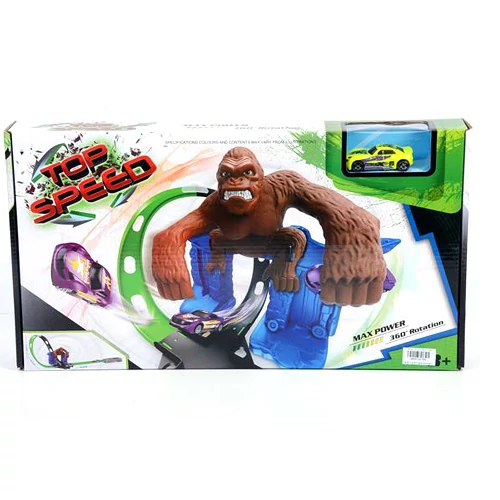 Vannak izgalmas és veszélyes versenypályák, de ha egy igazán különleges pályával szeretnénk meglepni a gyerekeket, akkor ez a legjobb választás, hiszen nem csak az háromszázhatvan fokos hurokszerű kanyarral nehezíti meg a versenyzők dolgát, hanem még az őrjöngő Konggal is számolniuk kell a versenyzőnek. A készletben található kisautót csak bele kell helyezni az elkészült pálya elején lévő indítószerkezetbe, majd egyetlen gombnyomással útjára is indíthatjuk, és reménykedhetünk, hogy megússza a hatalmas majom tombolását.