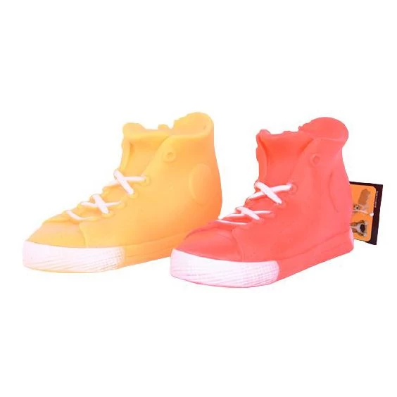 Ez a gumis tornacipős kutyajáték minden kutyának örömet okoz. Ezek a tornacipők strapabíró gumi anyagból készültek, amivel beltéren és kívül is játszható.