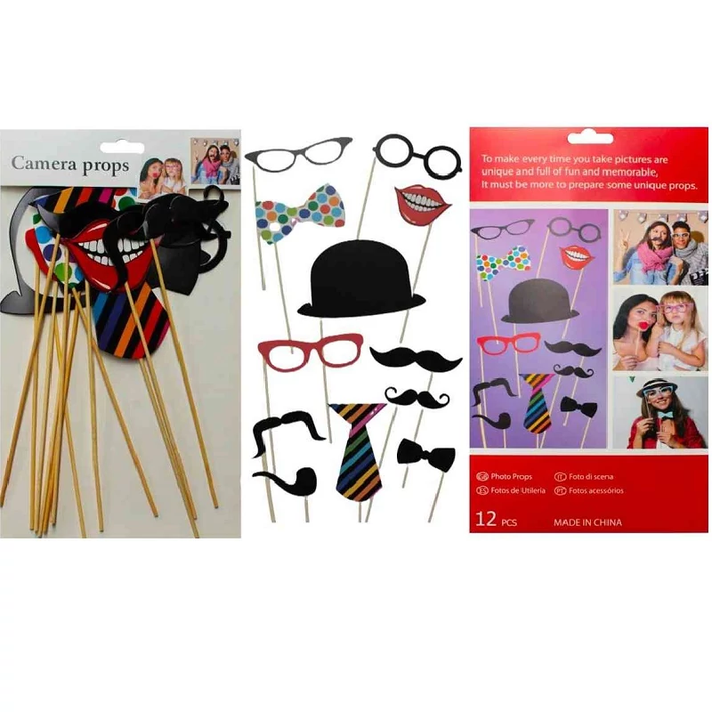 Dobd fel az év utolsó estéjét ezzel a vidám és színes 12 darabos party kellék készlettel! A csomagban minden megtalálható, ami egy emlékezetes és vicces fotózáshoz kell: bajuszok, szemüvegek, csokornyakkendők, kalapok, pipa, bajszok és még sok mókás kiegészítő – mindegyik erős kartonból készülve, stabil fa pálcikára rögzítve.