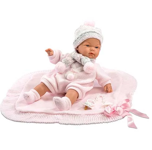 Llorens babák széles választékával találkozhatsz webshopunkban, ahol újszülött, csecsemő, és kisgyermek babák várnak rád több féle méretben, színekben gazdag, stílusos ruhákat viselve. Az újszülött baba arcocskája, és teste olyan, akár az igazié, még a redők is megjelennek rajta. Színes sapkája, és sálja mintája megegyezik, melyek tökéletesen passzolnak a rózsaszín rugdalódzó színével. Takarójának köszönhetően a kicsi nem fog fázni, macis cumija pedig a ruhájára csíptethető kivitelben készült, így mindig nála lehet, ha nyűgös kedvében lenne.