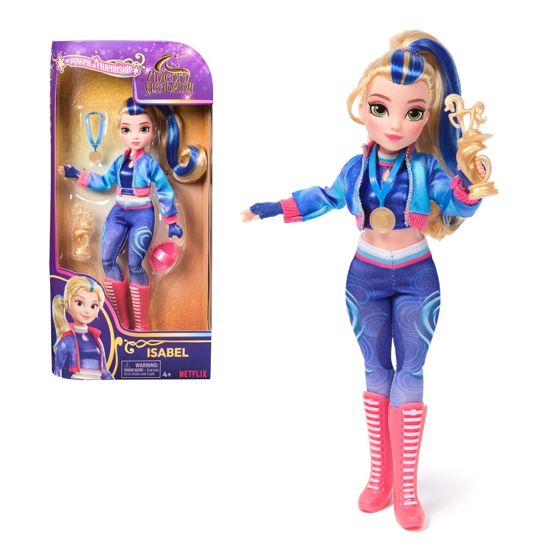 A baba modern, sportos öltözékben érkezik: kék-lila színvilágú kabátja, mintás nadrágja és rózsaszín csizmái stílusos megjelenést biztosítanak, miközben tökéletesen tükrözik Isabel karakterét. A hosszú, fésülhető haj és a mellékelt fésű kreatív játékra ösztönzi a gyerekeket, míg az arany trófea és a nyakláncra akasztható érem a játék során elért "sikereket" jelképezik. A figura kezei és lábai mozgathatóak, így dinamikus pózokat is fel tud venni – ideális szerepjátékhoz és gyűjtéshez is.