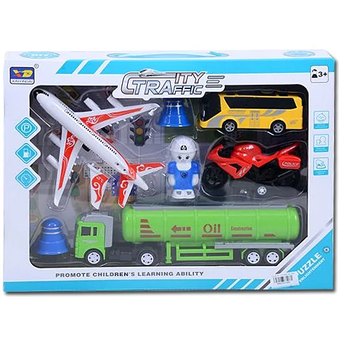 Ez a remek játékszett repülőgépet, buszt, motort és még egy tartálykocsit is tartalmaz, így igazán változatos játékélmény vár a gyerekekre! A városi járgányok mellet a játékszett része a figura és a bóják is, mely kiegészítőket bevonhatnak a játékba a kicsik. A járművek hátrahúzós meghajtással ellátottak, ezáltal a gyerekek könnyedén útnak indíthatják őket a talajon gurítva, vagy akár versenyezhetnek is velük.