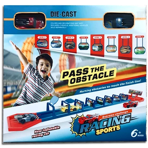 Egyetlen lökéssel máris elkezdődhet az izgalmas játék a gyerekek számára, akik a kisautókat különböző akadályokon lökhetik át. A versenypálya összeállítása után összesen nyolc akadály kerül az úton a kisautók elé, melyeket a lendület elvesztésével egyre nehezebb lesz leküzdeniük. A könnyen összeépíthető versenypálya két autóval érkezik a kicsikhez, így máris kezdetét veheti a játék!