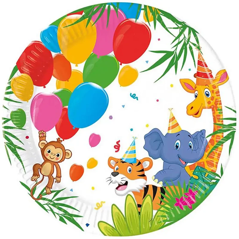 Tedd különlegessé a gyerkőc születésnapi zsúrját ezekkel az aranyos dzsungeles mintájú papírtányérokkal! A szettben található tányérokon bulira kész állatok – kis majom, tigris, elefánt és zsiráf – köszöntik a kis vendégeket, színes lufik és konfetti kíséretében. A trópusi levelek és a vibráló színek igazi dzsungelhangulatot varázsolnak az asztalra, amit minden kisgyerek imádni fog.
