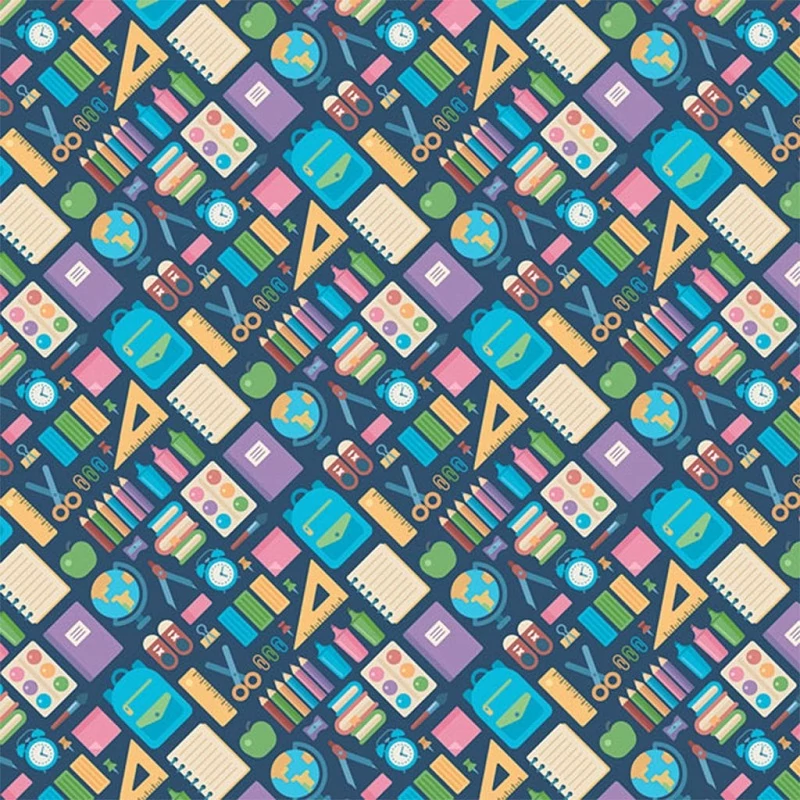 Színes, iskolai témájú grafika (ceruzák, füzetek, hátizsák stb.)