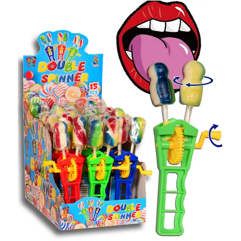 A Double Spinner Gyümölcsízű Nyalóka (30 g) kettős forgórészű, élénk színű és gyümölcsös ízű nyalóka – vízszintes és függőleges forgással is játszó formatervezésben, szórakoztató nassolnivaló gyerekeknek és felnőtteknek egyaránt.