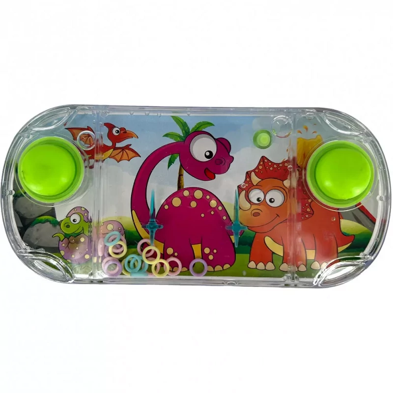 Retró vízi türelemjáték - pink dínós mintával. Ez az aranyos dínós mintás vízi türelemjáték a gyerekek és a felnőttek által egyaránt kedvelt játék, melynél az a cél, hogy a gombok nyomkodásával a vízben irányítsuk a karikákat a megfelelő kardokra. Minél kitartóbbak vagyunk, annál nagyobb az esély, hogy teljesítsük a játék lényegét. A türelemjáték nem olyan könnyű, mint amilyennek tűnik, figyelmet, koncentrációt, türelmet és kézügyességet igényel. Hosszabb utakra, de várakozás közben is megfelelő.