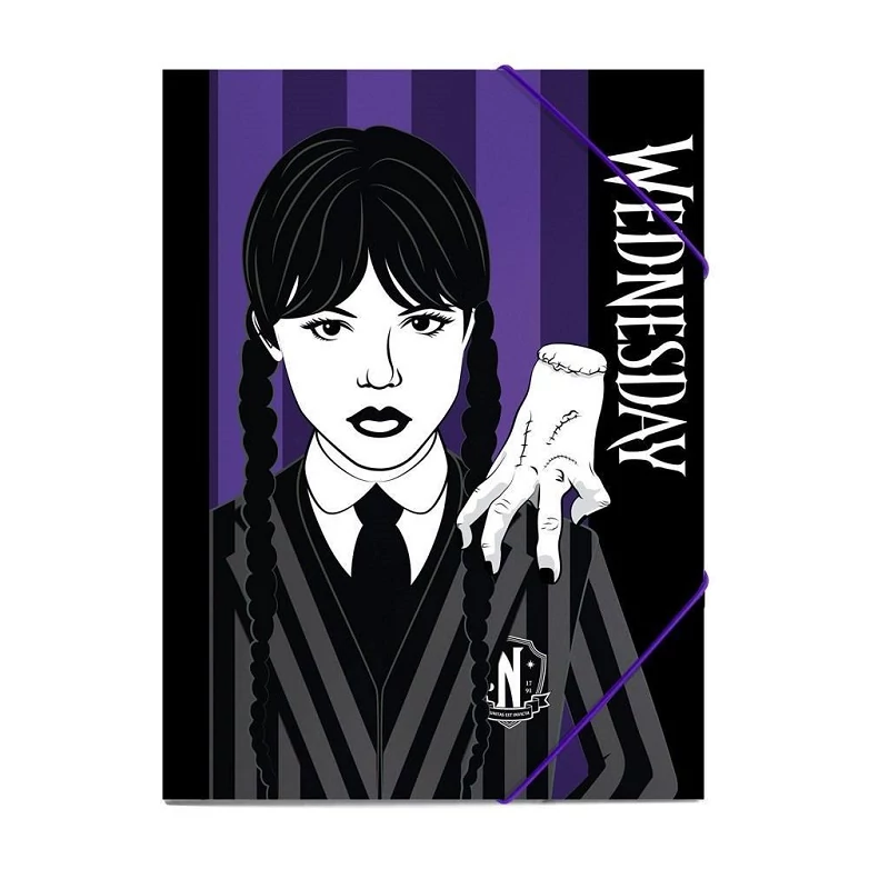 A Wednesday gumis mappa tökéletes választás a misztikus hangulatok és a stílusos tárolási megoldások kedvelőinek. Ez a 25x35 cm méretű mappa ideális társ lehet az iskolában vagy otthon, amely praktikus és egyben divatos megoldást nyújt a dokumentumok, jegyzetek és rajzok rendszerezésére. A mappa borítóján a híres Wednesday Addams, az Addams család ikonikus tagja látható, jellegzetes fonott hajával és komor tekintetével, mellette pedig a híres Thing kézfejével. A fekete és lila színek dominálnak, amelyek tökéletesen visszaadják a Wednesday sorozat sötét, mégis elbűvölő hangulatát. A strapabíró műanyagból készült mappa ellenáll a mindennapos használatnak, így hosszú ideig megőrzi újszerű állapotát. A gumis záródás biztosítja, hogy a mappa tartalma mindig biztonságban legyen, így nem kell aggódnod, hogy a papírok szétszóródnak a táskádban.