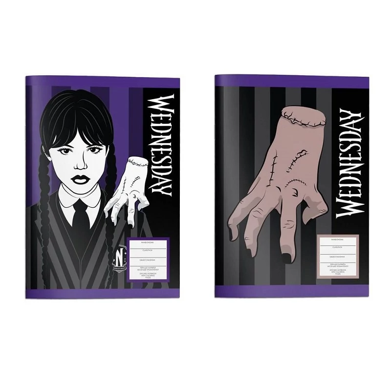 Ezek a 17x25 cm méretű, 40 lapos jegyzetfüzetek kétféle változatban érhetők el, mindegyik egyedi és szemet gyönyörködtető dizájnnal. Az első változat borítóján Wednesday Addams látható jellegzetes fonott hajával és komor tekintetével, mellette a híres Thing kézfejével. A fekete és lila színek dominálnak, amelyek remekül visszaadják a Wednesday sorozat sötét, mégis elbűvölő hangulatát. A második változat borítóján szintén Thing, a varrott kézfej látható, amely az Addams család egyik legikonikusabb szereplője. A fekete csíkos háttér és a lila részletek még inkább kiemelik a füzet egyediségét. Ez a dizájn tökéletes választás a misztikus és szokatlan dolgok kedvelőinek. Mindkét jegyzetfüzet praktikus méretű, így könnyedén elfér bármilyen iskolatáskába vagy hátizsákba. A 40 lapos kivitel pedig elegendő helyet biztosít a jegyzetek, rajzok és ötletek számára, miközben a minőségi papírra öröm írni.